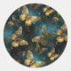 Un conjunto de elegantes pegatinas redondos con un patrón de mariposas en brillantes tonos dorados y azules brillantes.