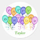 Para tus invitaciones de fiesta, tarjetas de cumpleaños o cualquier otra decoración de cumpleaños con una superficie suave, asegúrate de agregar estos animados Pegatinas de los globos de cumpleaños feliz. Happy Birthday Balloons es un ilustracion original de dos filas de globos multicolores con colores vivos brillantes y correas coordinadas. Cada globo presenta una sola letra en un color que coincide con el globo cuando todos juntos deletrean "Feliz Cumpleaños". Personalice este diseño festivo añadiendo el nombre de la persona especial de cumpleaños bajo los globos. Coordine todas las necesidades de su fiesta recogiendo todos los productos de los globos de cumpleaños feliz.