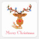Pegatina mostrada con una impresión festiva de Rudolph de Navidad con luces.