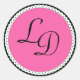 Elegante pegatina redondo, con gráficos de un círculo de borde de vieiras de color rosa y blanco, sobre un fondo negro. Personalizar las letras negras con el monograma de la novia y el novio. Excelentes como focas para los sobres de invitación a la boda.