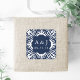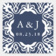 Selle sus sobres de invitación a la boda, favores y más con nuestros elegantes pegatinas de inspiración marroquí en marina y blanco. El diseño cuadrado redondeado presenta sus iniciales y fecha boda rodeadas por un borde geométrico en blanco sobre un fondo azul marino clásico. Coordina con nuestra colección de invitaciones a bodas de Marrakesh en la marina.