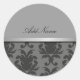 Pegatinas de monograma de clase con elegante patrón de damasco gris, un color de fondo que se puede personalizar, junto con un separador de acentos metalizado impreso y un espacio de nombres de monograma que se puede personalizar con cualquier nombre o iniciales. Perfecto como pegatinas o etiquetas de agradecimiento, fiestas, etiquetas de regalo o etiquetas de nombre.
