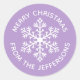Un copo de nieve blanco sobre un fondo morado con "Feliz Navidad" de la familia que lo rodea.