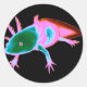 Un axolotl azul y rosa neón sobre un fondo negro.