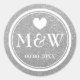 Purpurina de plata redonda y monograma blanco favorecen a los pegatinas. Corazón lindo con iniciales de nombre monogramadas de novia y novio más fecha de matrimonio. Pegatinas de agradecimiento personalizados o selladores de sobres/sellos de lujo. Tipografía elegante para las iniciales del nombre de novia y novio. Diseño de borde de moda / diseño elegante. Color del fondo del personalizable. Diseño romántico de temas de amor. Luminosas brillantes plateadas purpurinoso y fondo brillante. Estilo de lujo.