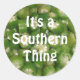 Fotografía de okra cortada en los bordes del pegatina con las palabras "Es algo del sur" impresas en la parte superior.