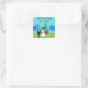 Estas pegatinas de parejas de boda retro personalizables le harán oír las campanas de boda. El diseño de arte minimalista de estilo años 60 cuenta con un novio y una novia en el día de su boda. La feliz pareja se ve lo suficientemente buena como para estar en la cima de una torta de boda. Pero no lo son. Están parados sobre hierba verde y exuberante. El debonario Mr. está usando un clásico esmoquin negro con corbata de arco negro. ¡Abajo, damas! ¡Se lo llevaron! Está sosteniendo la mano de su hermosa señora, que se ve positivamente radiante en su longitud de té, vestido blanco con cintura ajustada a la forma y falda flarroja. Verdaderamente parece una princesa con su tiara y su velo de boda blanco y lujoso apoyándose en su bonita cabeza rubia. Al lado, un camino en el césped conduce a la capilla más encantadora del mundo. La pintoresca iglesia de la tez y el color turquesa es el lugar perfecto para decir: "¡Lo hago!" Sí, aquí está la iglesia. Aquí está el campanario. Solamente podemos asumir que, detrás de ese rojo brillante, las puertas dobles son un cuarto de personas que solamente esperan compartir la felicidad de esta pareja. El entorno pintoresco también incluye cuatro árboles de dibujos animados estilísticos en tonos azules. Es un día hermoso para una boda, como podemos ver desde el imperfecto cielo acuático. Lo único que falta en este diseño moderno de mediados de siglo es el arroz, y podemos suponer que eso será inminente. Personaliza con nombres y fecha. Este diseño se puede usar para guardar las tarjetas de fecha, notas de agradecimiento de boda, invitaciones informales y para felicitar a tus recién casados favoritos.