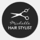 Pegatinas de peluquería redonda para peluquero. Diseño elegante con tijeras de barbero profesionales. Personaliza con nombre de peluquero, nombre de negocio, nombre de empresa, peluquería, esteticista, etc.