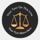Etiquetas de pegatinas de mensajes de la oficina del fiscal con texto que sigue la forma redonda del pegatina que se puede personalizar en línea. Diseñado para que un abogado promueva su marca, promueva un mensaje o un evento especial y se crea con una escala de justicia de tono dorado.