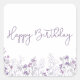 Hermosa plaza morada y floral gris "feliz cumpleaños" pegatina. Perfecto para sobres, bolsos de favor o etiquetas.