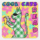 Estos coloridos pegatinas de incentivos de lectura retro para los estudiantes dicen "Guay Cats Read" y presentan un gato de gingham verde que lleva sombras frescas mientras lee un libro.