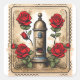 Pegatinas de sello romántico rojas hermosas. Buzón y rosas rojas en un sello retro. Arte vintage.
