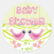 Sellos para sobres Baby Shower Redondeando Pegatinas. Invite a su familia, parientes y amigos a su fiesta de ducha de bebé y precinte los sobres con este pegatina redondo adorable con dos adorables birdies rosados en una rama de cal con flores. Las palabras que Baby Shower está escrito con una fuente encantadora con corazones sobre fondo limo rayado.