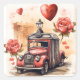 Bellas pegatinas de sellos románticos rojas. Coche rojo vintage, rosas rojas y globos rojos. Arte vintage.