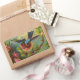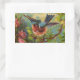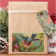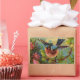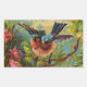 Esta impresión colorida ilustra un pájaro azul que descansa en una rama de un bosque lleno de flores. Esta vista muestra al pájaro a punto de tomar vuelo. Los colores azul claro, rosa, amarillo y verde hacen una imagen emocionante para la decoración y los accesorios personales.
