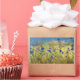 Colores y flores de maíz vivos azules florecen en un campo dorado de césped bajo un cielo azul pálido. El fondo rubio y verde también se ve interrumpido por el rosa brillante de las flores de hierba mojada.