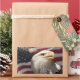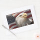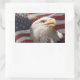 Foto de un águila calva con bandera estadounidense ondeando en el fondo.