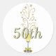 Grandes pegatinas de sobre fiesta de aniversario, con gráficos de una copa de champán rellena, decorados con un arco de tono dorado de bonito, en el tallo, y chorros de chispas que se disparan desde el vidrio. 50 en texto personalizado a través del cristal anuncia qué aniversario es, personalice este texto para que se adapte a su fiesta de aniversario. Elegante manera de terminar tus invitaciones para fiestas de aniversario de bodas.