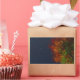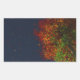 Mirando hacia arriba a través de las ramas de un árbol que se alza en otoño. Las hojas que caen de burdeos, rojos, dorados, naranjas, amarillos y azules brillan contra el cielo azul profundo.