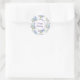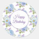 El pequeño pegatina redondo de feliz cumpleaños se muestra con una hermosa impresión floral azul y púrpura. Personalizar o compra como está. Imprimir material freepik.com