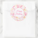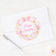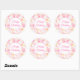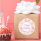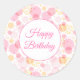 Se muestra un pegatina de cumpleaños feliz redondo y grande, con círculos rosados festivos impresos. Personalizar o compra como está.
