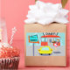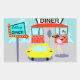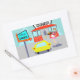 Sirva algo especial con estos Pegatinas de Diner Rectangle de los años 50. El diseño de los dibujos personalizados incluye un edificio de ladrillo rojo con ventanas azules, puertas dobles grises y un cartel blanco que dice "Diner" colgado en el techo. En el estacionamiento, hay una segunda señal en un poste. El cartel tiene un fondo turquesa y una flecha roja que apunta a "Don's Diner". El cartel ha hecho su trabajo porque hay un auto amarillo brillante con las aletas aparcadas al lado. A pesar de que no podemos verlos, los pasajeros del auto deben estar golpeándose los labios. Un monótono y joven carhop está patinando patinaje sobre ruedas en su camino al auto. Su pelo de morena está en una cola de poniente hinchable. Lleva un uniforme corto y rosado con guarnecido negro y delantal blanco. Equilibrado por un lado, el carrito lleva una bandeja negra con una hamburguesa gigante y una refrescante y anticuada botella de refresco. El fondo de la sala está verde azulado de nubes azul claro y de siluetas de cedros.