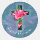 Impresionantes pegatinas de Bendiciones de Pascua con hermosas flores rosadas de Hibiscus superpuestas con cruz de borde azul con tonos tropicales. También puedes disfrutar de los muchos diseños de cruces de hibiscos cristianos disponibles en mi tienda. Fotografía original y diseño de Anura Design Studio.