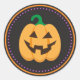 Pegatina de Halloween con un feliz y risible Jack o lantern dentro de un naranja y un borde morado. Utilícelo como pegatina de sello para sobres o para hacer tapones de quequitos. ¡¿O por qué no repartirlos como golosinas en lugar de caramelos en Halloween?! Diseño divertido y lindo personalizado para los niños.