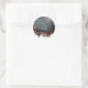 Esta vintage imagen de la tarjeta navideña muestra la escena de la luna de nieve mientras los huéspedes llegan en caballo y trineo para un Fiesta Navidad a la luminosa Mansión Victoriana. Perfecto en estos pegatinas de vacaciones.