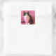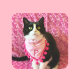 Estos lindos pegatinas presentan a Peaches el gato de Tuxedo con una bandana rosada "P" de bonito con pompones rosados en los bordes. Peaches está mirando directamente a ti para decir "hola" mientras estás sentado en una manta de bonito. El copyright Peaches the Tuxedo Cat