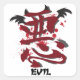 Pegatinas malvados kanji. Este es el símbolo japonés kanji para el mal, y está escrito como "aku" en inglés. En las historias japonesas, y en otras literaturas, este símbolo se usa para describir algo extremadamente oscuro y siniestro. El kanji para el mal tiene un aspecto muy distinto, pero he agregado una cola, alas oscuras y cuernos espinosos para que sea más reconocible a primera vista.