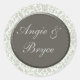 Pegatinas damasquinados con motivos plateados y blancos con el nombre de novia y novio. Cambia fácilmente a tus propios nombres en este diseño.