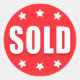 Pegatinas vendidos en redondo con texto blanco "Vendidos" en un fondo rojo con estrellas blancas.