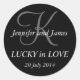 ¡Suerte en el amor! Pegatinas de monograma para Bodas. Personalizar sus nombres, fecha de boda, monograma y colores de este pegatina. Simplemente haga clic en el botón "PERSONALIZAR" y siga las instrucciones. Elke Clarke ©2011