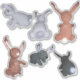 Muñecas de conejo conejo. Tres conejos (blanco, marrón, negro) en dos poses cada uno. Caras y espaldas delanteras o laterales con colas de algodón.