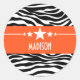Modernos y modernos Pegatinas Sassy Star Zebra con un fondo de moda de cebra en blanco y negro y un atrevido borde naranja adornado con un divertido motivo estrella. Este diseño ondulado puede ser personalizado con el texto personalizado de su elección. Haga clic en "Personalizar" para encontrar más opciones de personalización.
