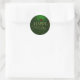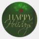 Pegatinas verdes oscuros con bayas huecas y Felices Fiestas en letra de guión dorado.