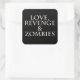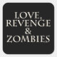 Pegatina cuadrado negro con "Amor, venganza y zombies". Conjunto de 6 pegatinas.
