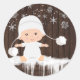 Pegatinas para baby shower de copo de nieve con adorable bebé vistiendo un traje blanco de nieve y sombrero sobre un fondo rústico de copo de nieve. Puedes agregar texto para personalizar estas adorables pegatinas de baby shower de invierno.