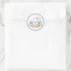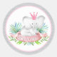 Pegatinas para baby shower de elefante niña con adorable elefante bebé llevando una corona de princesa sobre un fondo de hoja de palma de jungla. Estas dulces pegatinas de elefante bebé niña se pueden personalizar fácilmente con el texto de su elección y también puede cambiar el color del fondo.