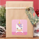 La ilustración presenta un lindo pequeño unicornio bebé blanco con una melena rosa y azul brillante. Un patrón de corazones rosados y estrellas para el fondo. Personalice con el mensaje de su fiesta. Pegatina decorativa para el primer cumpleaños de la niña.