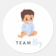 Estas adorables pegatinas redondas presentan a un bebé varón en un pelele azul con un chupete y el texto "Team Boy (Equipo Niño)". Una forma divertida y elegante de decorar los favores, sobres o decoraciones de fiesta en su celebración de revelación de género.