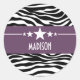 Moderno y moderno Pegatina Sassy Star Zebra con un fondo de moda de cebra en blanco y negro y un atrevido borde morado adornado con un divertido motivo estrella. Este diseño ondulado puede ser personalizado con el texto personalizado de su elección. Haga clic en "Personalizar" para encontrar más opciones de personalización.