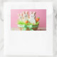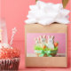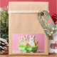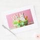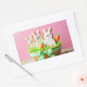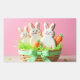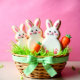 Cuatro galletas de conejo de Pascua y dos galletas de zanahoria en una canasta con hierba verde, fondo verde y un arco verde a cuadros.