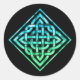 Un conjunto de pegatinas redondos de un diseño de nudo celta azul-verde con borde sobre un fondo negro.