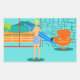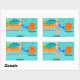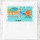 Cada día puede ser un día en la playa con estos Pegatinas Retro Surfer Dude. El diseño de arte minimalista, al estilo de los años 60, cuenta con un tipo dorado, rubio y surfista, todo listo para tomar una ola. Nuestro surfista en forma mira al océano a través de las puertas correderas de cristal de su casa frente a la playa. Está parado en su sala de estar de color agua. Podemos ver un aqua y turquesa, una pared de piedra y una moderna silla naranja de mediados de siglo. En el lado opuesto de la puerta de cristal se ve un patio. Más allá, hay una playa de arena dorada, palmeras balanceadas, un océano azul pavo real y un cielo acuático. A lo lejos, podemos ver una verde azulada isla volcánica, que por el momento está latente. Surfer Dude sostiene una tabla azul y lleva pantalones cortos azules con estampado de tiki. Atrapa algunas olas y comparte el amor con este diseño kitsch de verano!