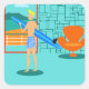 Todos los días puede ser un día en la playa con estos Pegatinas de Retro Surfer Dude. El diseño de arte minimalista, al estilo de los años 60, cuenta con un tipo dorado, rubio y surfista, todo listo para tomar una ola. Nuestro surfista en forma mira al océano a través de las puertas correderas de cristal de su casa frente a la playa. Está parado en su sala de estar de color agua. Podemos ver un aqua y turquesa, una pared de piedra y una moderna silla naranja de mediados de siglo. En el lado opuesto de la puerta de cristal se ve un patio. Más allá, hay una playa de arena dorada, palmeras balanceadas, un océano azul pavo real y un cielo acuático. A lo lejos, podemos ver una verde azulada isla volcánica, que por el momento está latente. Surfer Dude sostiene una tabla azul y lleva pantalones cortos azules con estampado de tiki. Atrapa algunas olas y comparte el amor con este diseño kitsch de verano!