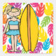 Un chica cabelludo rubio con una tabla hawaiana anaranjada contra un fondo de las hojas tropicales de los multicolors en los pegatinas que hacen juego nuestras invitaciones de la persona que practica surf del chica y sellos rubios.