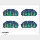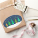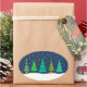 Diseño geométrico moderno de cinco abetos en verde azulado, turquesa y amarillo dorado. El cielo es una marina con nieve blanca cayendo.