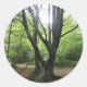 Esta hermosa hoja de pegatinas redondos muestra una fotografía tomada en un bosque caducifolio británico. En primer plano hay un gran árbol con muchas ramas torcidas. El sol brilla a través de la masa de ramas, creando un maravilloso contraste entre la oscuridad del gran árbol y la luz del sol y los árboles verdes en el fondo.